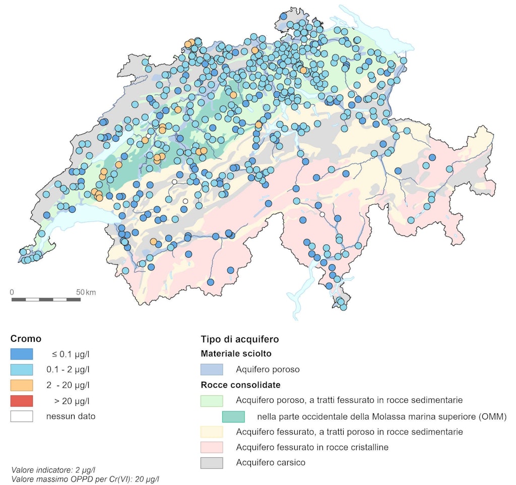 Le concentrazioni di cromo sono generalmente basse e inferiori a 2 µg/l. Il valore massimo di 50 µg/l per il cromo e 20 µg/l per il cromo(VI) previsto dall’OPPD per l’acqua potabile non viene superato in nessuna stazione di misurazione.