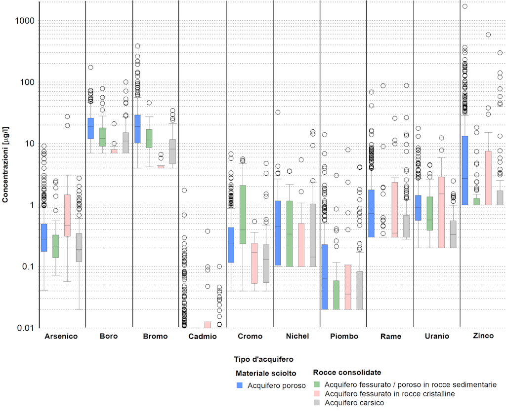 Le concentrazioni di elementi in traccia nelle acque sotterranee sono generalmente basse e riflettono principalmente i valori di fondo naturali. Le acque sotterranee in rocce cristalline presentano le concentrazioni più elevate di arsenico e uranio. Concentrazioni leggermente elevate di boro, bromo, cadmio, piombo, rame e zinco si registrano principalmente negli acquiferi porosi in materiale sciolto presenti nelle aree caratterizzate da insediamenti e agricoltura.