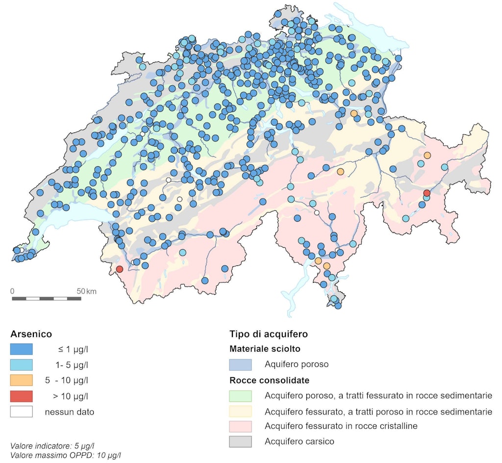 Il valore massimo di 10 µg/l previsto dall’OPPD per l’arsenico nell’acqua potabile viene superato rispettivamente in una stazione di misurazione nei Cantoni del Vallese e dei Grigioni. Le maggiori concentrazioni sono riconducibili a fonti geogeniche nelle rocce cristalline.