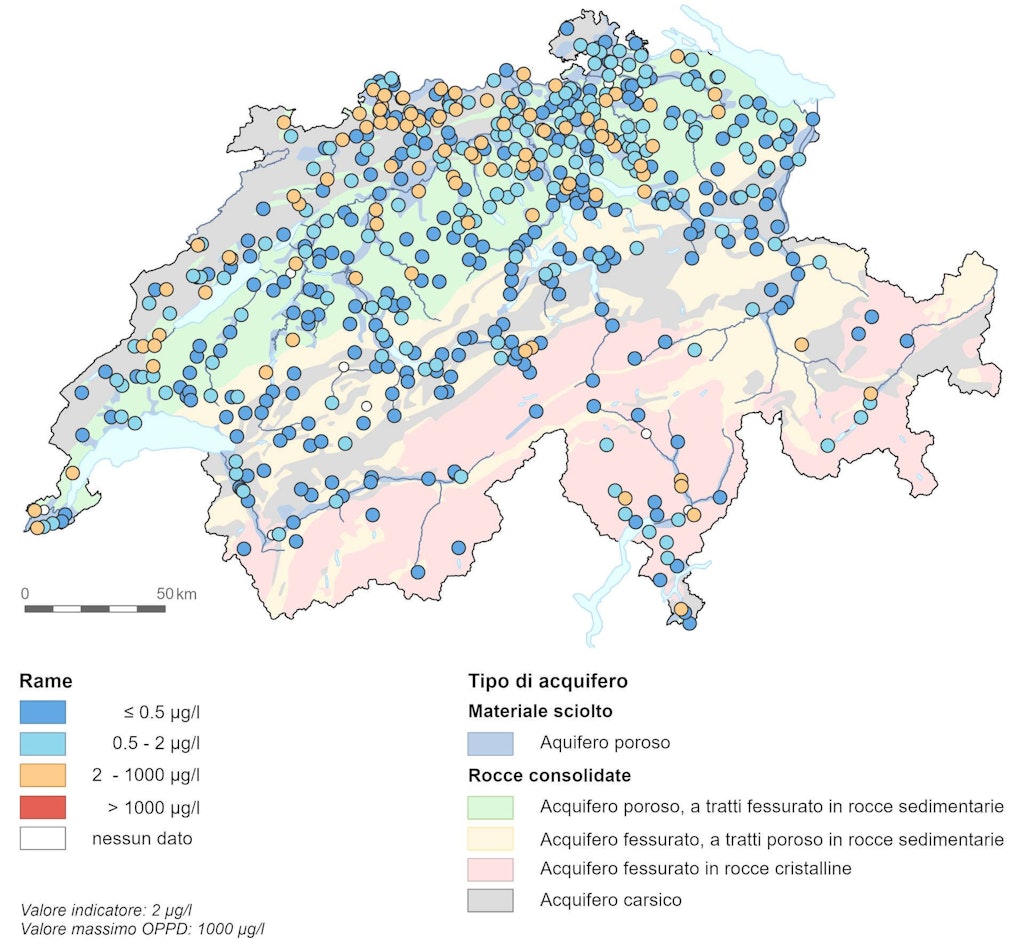 A livello nazionale, le concentrazioni di rame sono più elevate nel Giura e nell’Altopiano rispetto alle Prealpi e alle Alpi, dove, salvo poche eccezioni, sono inferiori a 2 µg/l. Il valore massimo di 1000 µg/l previsto dall’OPPD per l’acqua potabile non viene superato in nessuna stazione di misurazione.