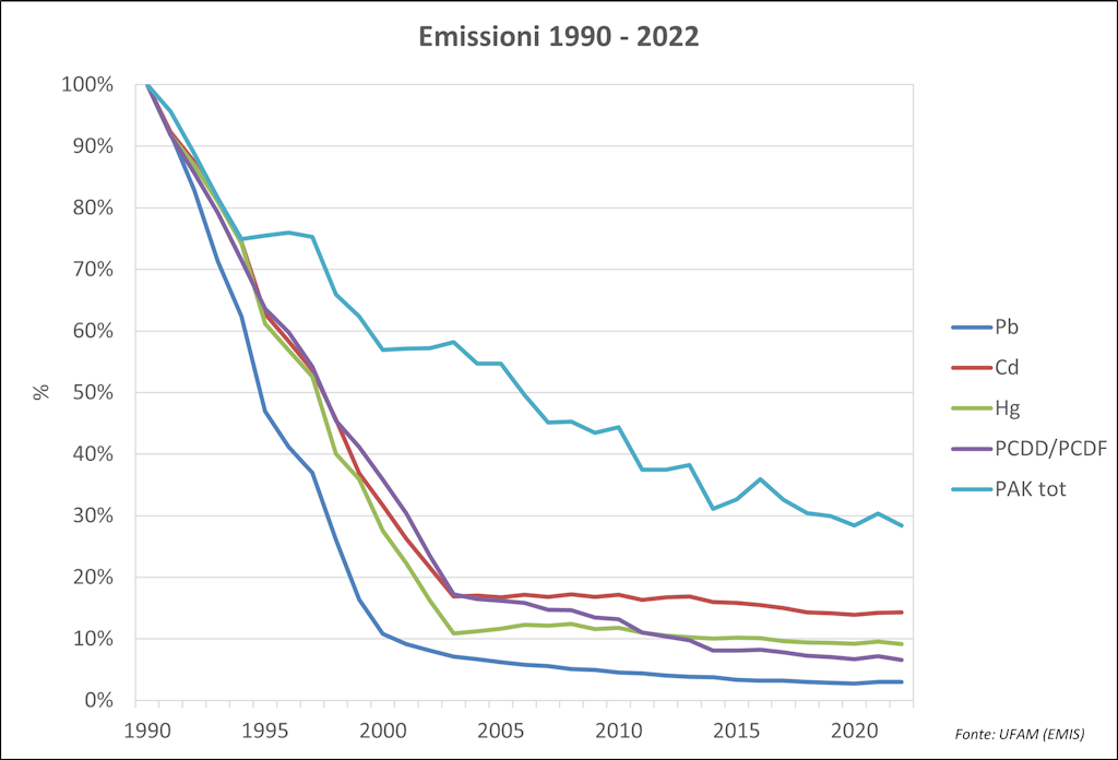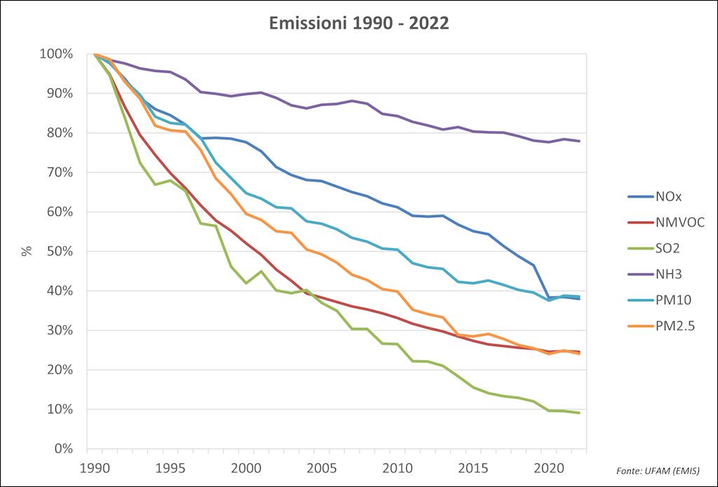 Dagli anni 1990 le emissioni di inquinanti atmosferici in Svizzera sono diminuite. Le modellizzazioni delle emissioni e i rilevamenti mostrano che per i singoli inquinanti vi sono state delle riduzioni tra il 22% (ammoniaca) e il 97% (piombo). Questi miglioramenti sono stati raggiunti grazie all’introduzione di severe prescrizioni e di misure realizzabili tecnicamente e sopportabili economicamente grazie a uno sviluppo rafforzato.