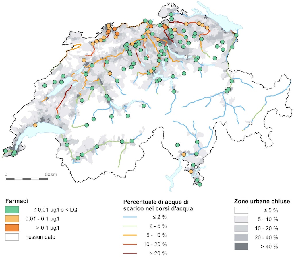 In Svizzera, la presenza di residui di farmaci e dei loro metaboliti nelle acque sotterranee è rilevata nel 15% circa delle stazioni di misurazione, soprattutto in quelle situate in rocce sciolte in prossimità di fiumi. Attraverso le canalizzazioni e gli impianti di depurazione, i farmaci confluiscono nei corsi d’acqua e da lì nelle falde sotterranee per infiltrazione attraverso l’acqua dei fiumi.
