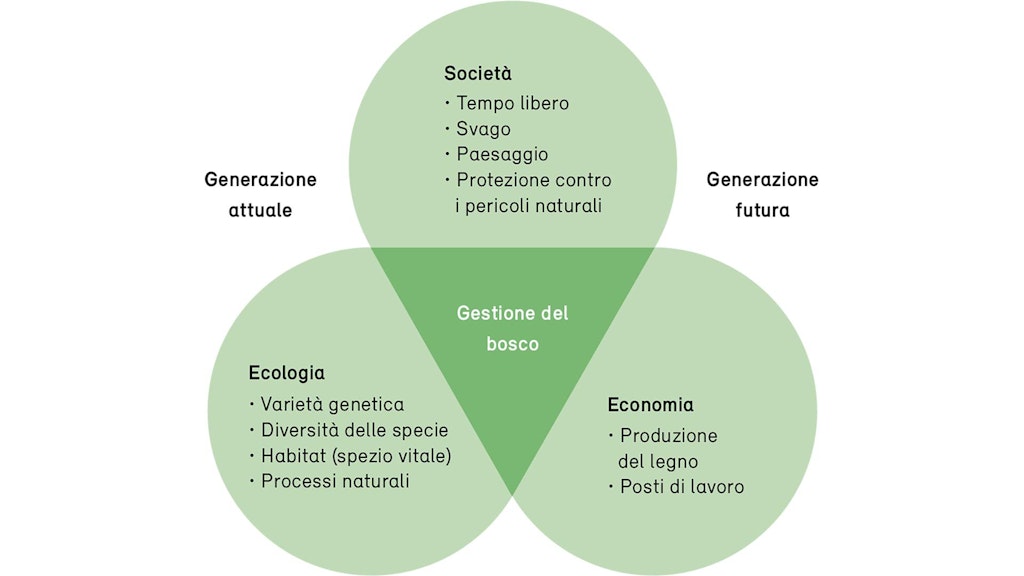 Una gestione forestale sostenibile tiene conto in egual misura degli aspetti ecologici, sociali ed eco-nomici della sostenibilità (vedi grafico seguente).