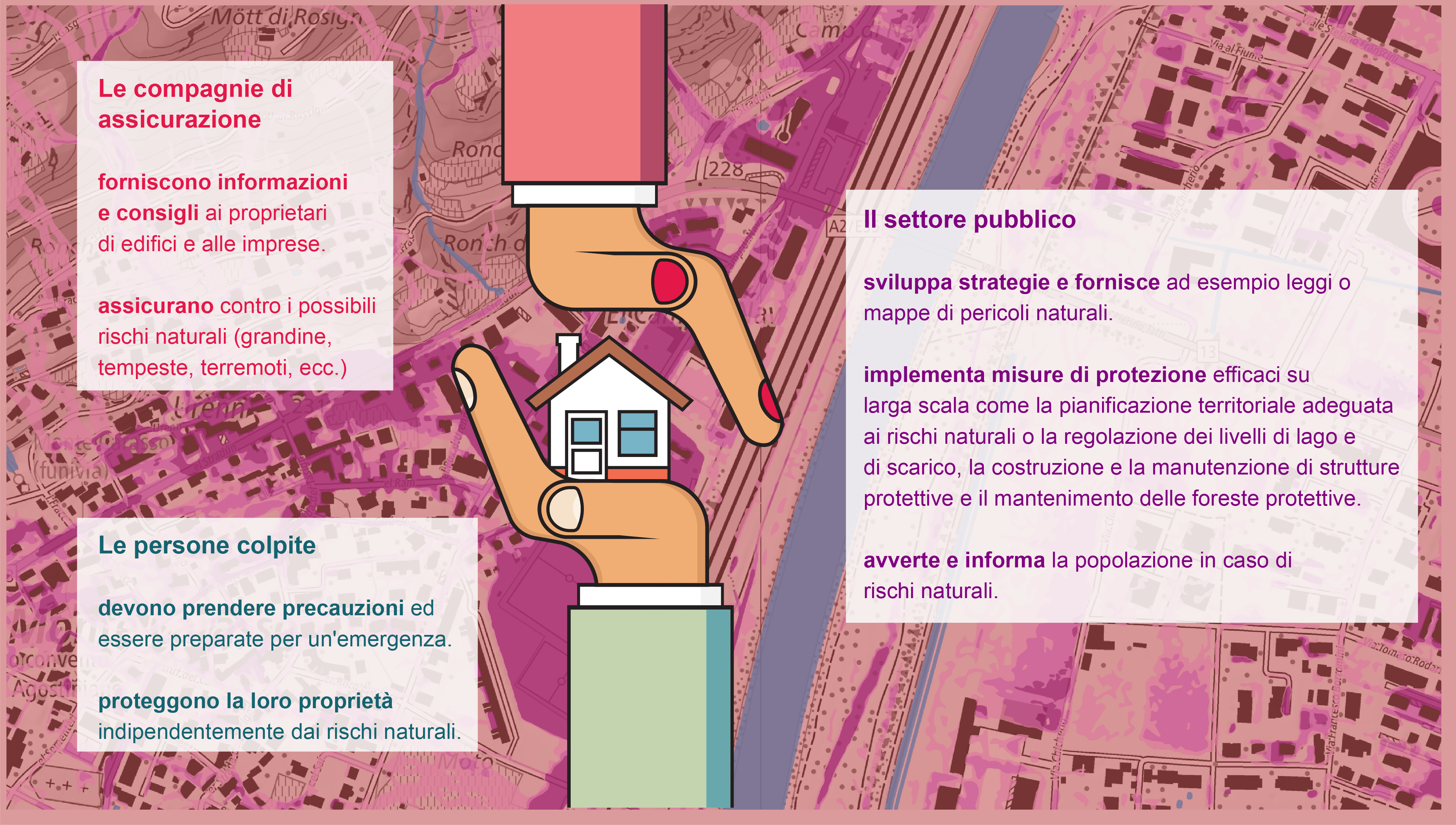 Anche le compagnie di assicurazione danno un importante contributo, offrendo alle persone interessate consulenza in materia di pericoli naturali, di misure e assicurando i danni.
