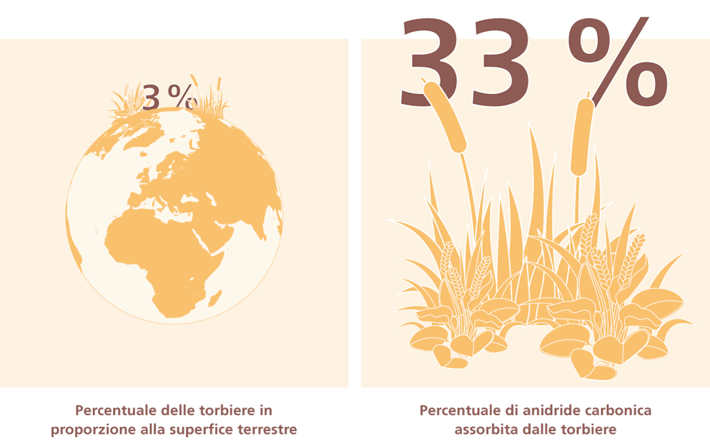 Il suolo delle torbiere agisce come una spugna per i gas climalteranti e svolge quindi un ruolo importante per l’equilibrio climatico globale. Le torbiere costituiscono solo il tre per cento della superficie terrestre globale ma assorbono il doppio di anidride carbonica rispetto alla somma di tutte le foreste. In totale, le paludi immagazzinano un terzo dell’anidride carbonica assorbita dal suolo. È il risultato di un processo lungo e complicato. Le torbiere si formano quando le piante marciscono su un terreno molto umido. Da tali piante così private dell’ossigeno, si forma un substrato di torbiera. Si tratta di un processo che avviene lentamente: per crescere di un metro, la torbiera impiega mille anni.