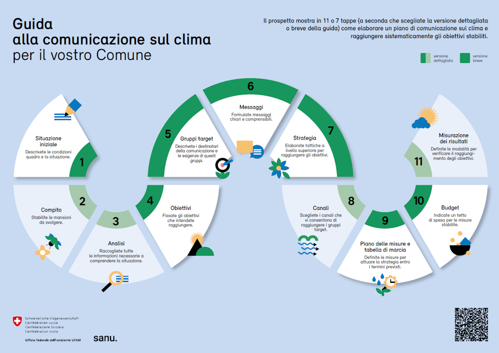 La guida alla comunicazione sul clima supporta i comuni di piccole e medie dimensioni nella loro comunicazione sul clima. Oltre alle istruzioni per i concetti di comunicazione (11 o 7 passaggi), molti consigli concreti e liste di controllo su come la comunicazione sul clima può avere successo, la guida contiene anche una panoramica di tutti i canali di comunicazione, una raccolta di buoni esempi di comunicazione e modelli pratici.