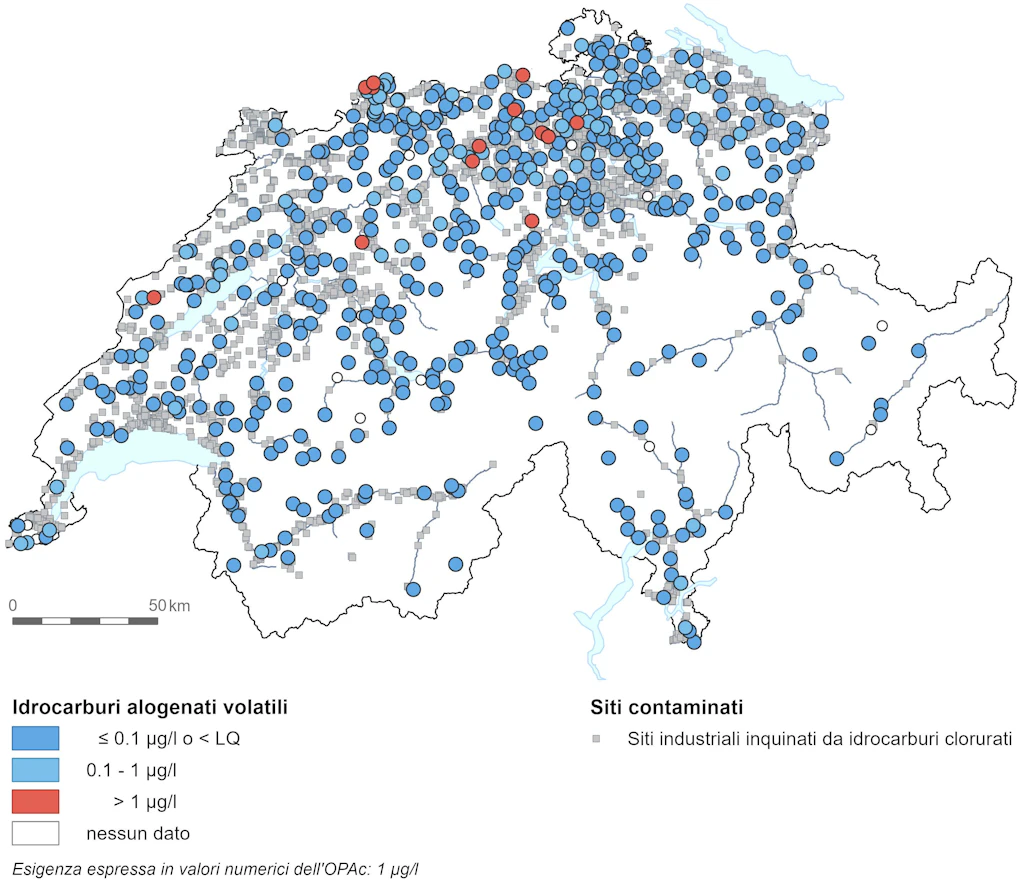 Secondo l’ordinanza sulla protezione delle acque (OPAc), le acque sotterranee non devono in generale contenere sostanze sintetiche persistenti. Per le acque sotterranee utilizzate come acqua potabile o previste a tale scopo, si applica anche un valore limite («esigenza espressa in valori numerici») di 1 microgrammo per litro (µg/l) per gli idrocarburi alogenati volatili e gli idrocarburi aromatici monociclici e di 0,1 µg/l per gli idrocarburi aromatici policiclici.