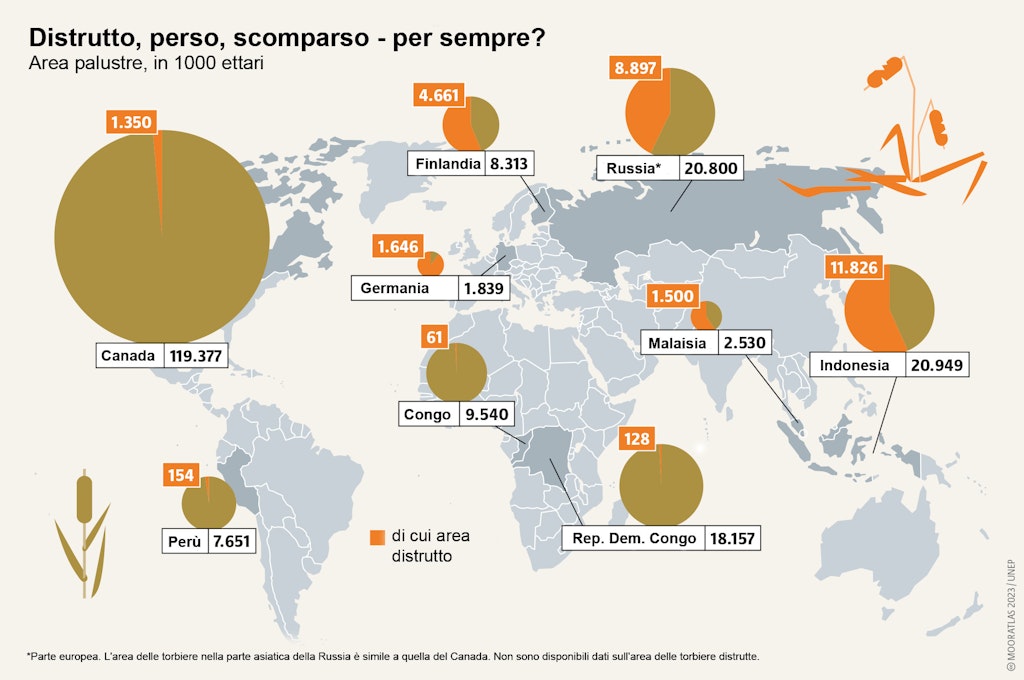 Nonostante rappresentino meno dello 0,5 per cento della superficie terrestre mondiale, le paludi prosciugate rilasciano circa il 4 per cento dei gas serra di origine antropica.