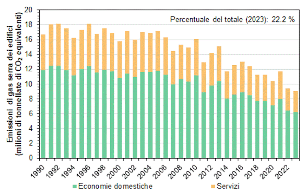 Il settore Edifici comprende le emissioni derivanti dalle economie domestiche (edifici residenziali) e dai servizi (edifici commerciali).