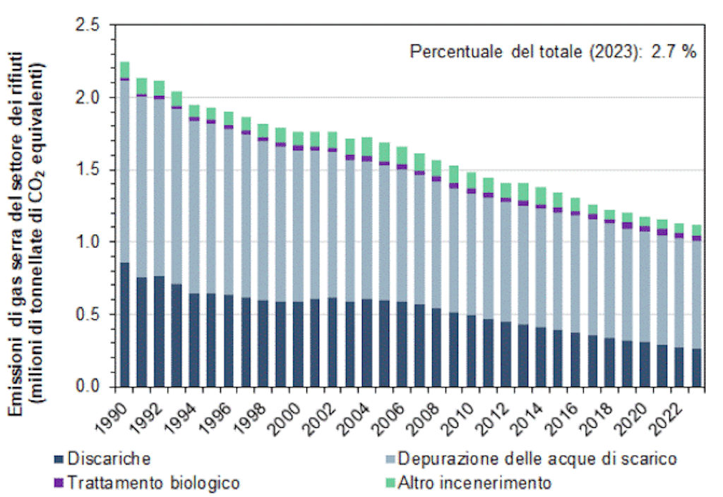 Nelle emissioni di gas serra del settore Rifiuti dominano le discariche e gli impianti di depurazione delle acque. Si tratta prevalentemente di emissioni di metano (CH4) e protossido di azoto (N2O). Altre emissioni sono ascrivibili al trattamento biologico (compostaggio e fermentazione di rifiuti negli impianti di biogas) nonché agli altri tipi di incenerimento senza impiego a scopo energetico (incenerimento illegale, incenerimento di fanghi di depurazione, incenerimento di rifiuti agricoli ecc.).