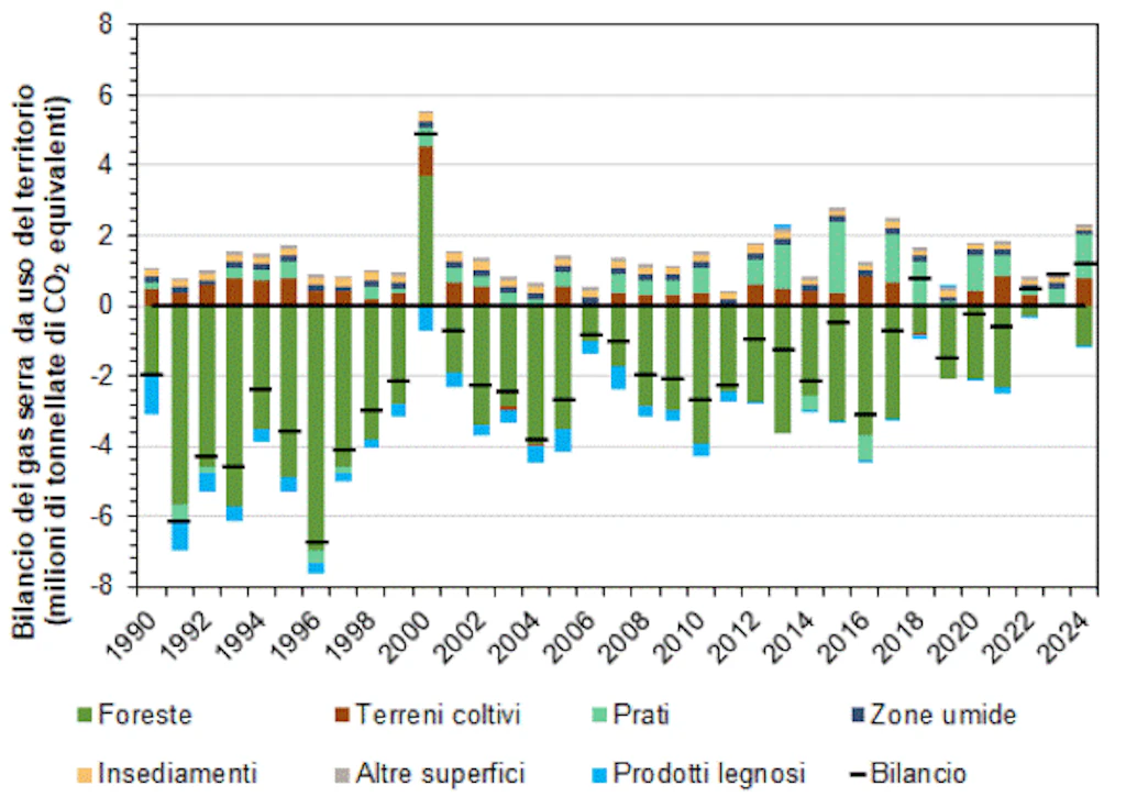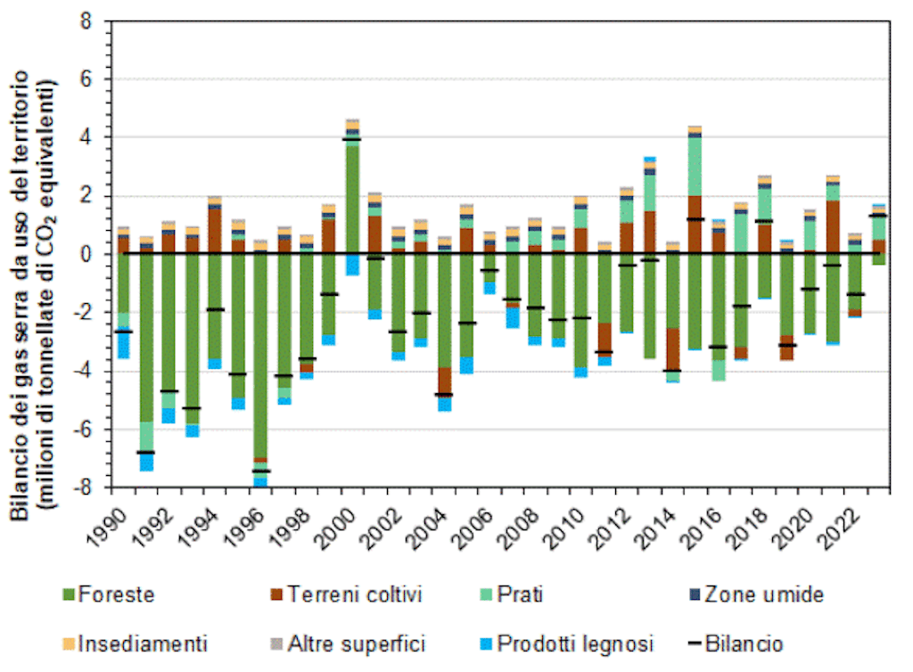 I flussi di gas serra vengono rilevati per sei categorie di uso del territorio: foresta, terreni coltivi, superfici inerbite, zone umide, insediamenti e altre superfici. Inoltre, viene considerato il carbonio contenuto nei prodotti di legno svizzeri. In questo settore il CO2 è di gran lunga il principale gas serra. Alle emissioni contribuiscono in piccola parte anche il metano (CH4) e il protossido di azoto (N2O) prodotto da incendi, perdita di humus, bacini di ritenuta e suoli torbosi prosciugati. Le emissioni di CH4 e N2O vengono convertite in CO2 equivalenti e aggiunte alle emissioni di CO2.
