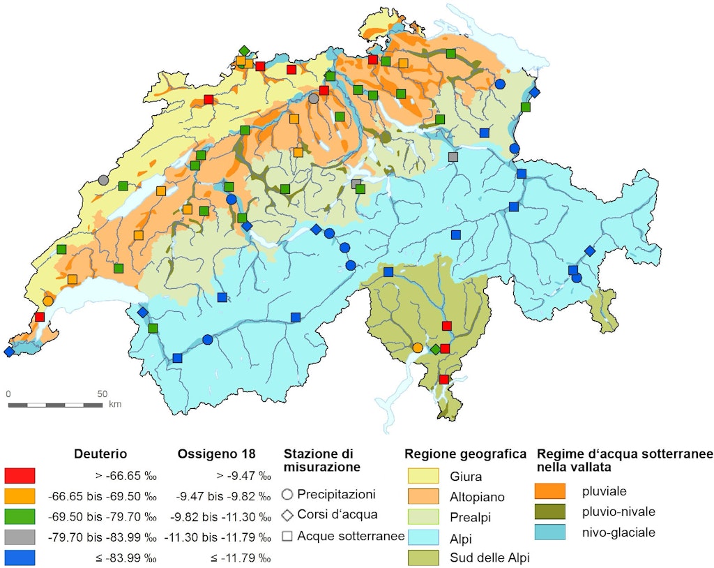 Nel quadro del modulo ISOT dell’Osservazione nazionale delle acque sotterranee NAQUA, dal 1980 vengono raccolti dati di riferimento sugli isotopi nelle acque piovane (13 stazioni di misurazione) e nei corsi d’acqua (9 stazioni di misurazione) per studi idrologici applicati. Nel quadro di uno studio pilota, tra il 2006 e il 2013 nelle 50 stazioni di misurazione del modulo TREND di NAQUA sono stati analizzati il deuterio e l’ossigeno-18 allo scopo di caratterizzare la dinamica della costituzione della falda freatica e l’interazione tra acque superficiali e acque sotterranee.