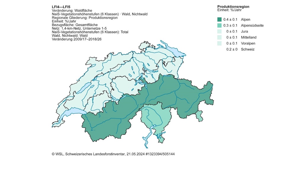 Il bosco si estende per 1,3 milioni di ettari, pari al 32 per cento della superficie nazionale, con forti differenze a livello regionale: il Sud delle Alpi è particolarmente ricco di boschi, che arrivano a coprire una superficie pari quasi al 55 per cento; seguono il Giura con il 40 per cento, le Prealpi con il 35 per cento e le Alpi con il 28 per cento della superficie totale coperta da boschi. La percentuale minore (24 %) si registra sull’Altopiano densamente popolato. La boscosità varia in base all’altitudine: i boschi svizzeri si trovano principalmente a quote comprese tra i 600 e i 1800 metri s.l.m., con una maggiore prevalenza al di sopra dei 1000 metri. Al Sud delle Alpi, invece, si registra una copertura di oltre l’80 per cento già a partire da 600 metri s.l.m.