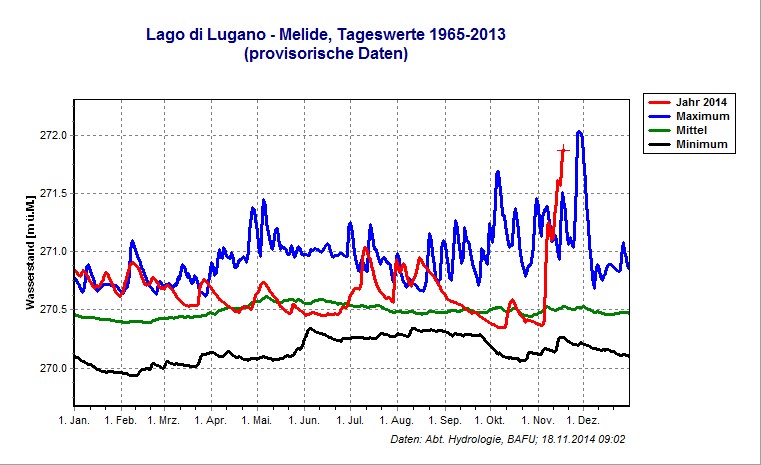 28.11.2014 - Rapporto idrologico speciale del 18 novembre 2014 dell’Ufficio federale dell’ambiente (UFAM). Nel novembre 2014 uno sbarramento a sud con diverse fasi di precipitazioni intense ha causato piene nei laghi ticinesi. Il lago Maggiore e il lago di Lugano hanno superato il limite di piena e sono esondati.