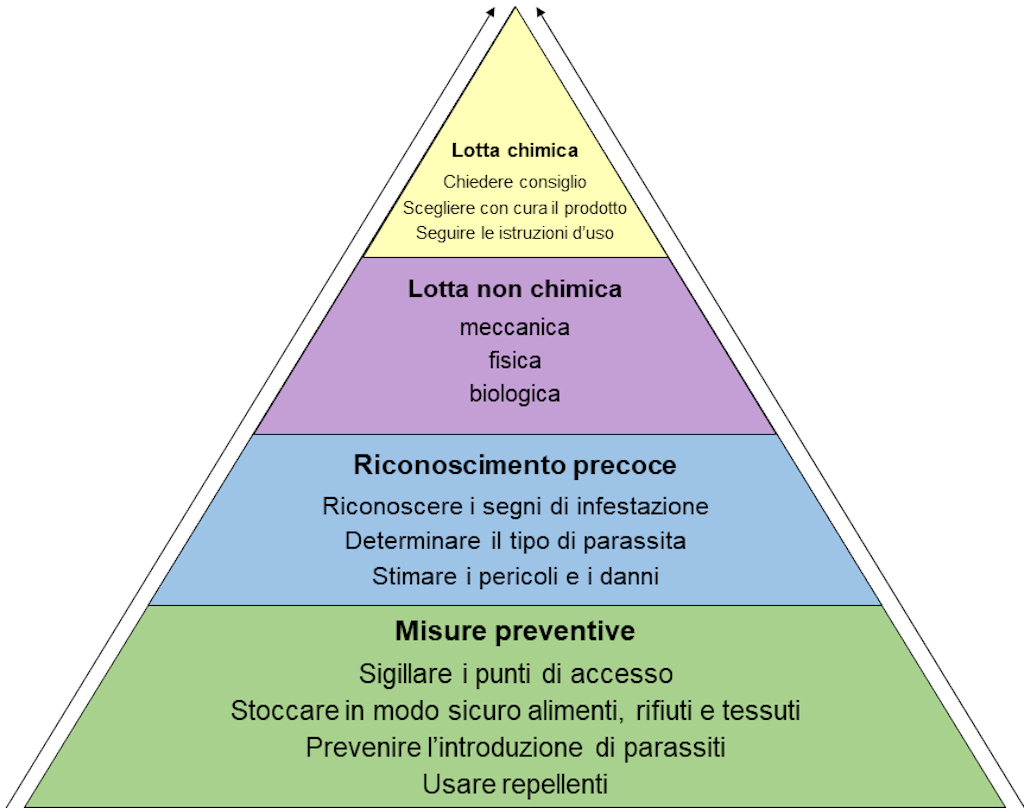 Il concetto di lotta integrata contro i parassiti si basa sull’interazione di diverse misure in funzione della situazione. Viene rappresentato attraverso una piramide con struttura a più livelli e persegue un approccio globale alla lotta contro i parassiti. Comprende la prevenzione di un’infestazione parassitaria nella misura del possibile, il suo riconoscimento precoce e, se necessario, il suo controllo con metodi di lotta adeguati.
