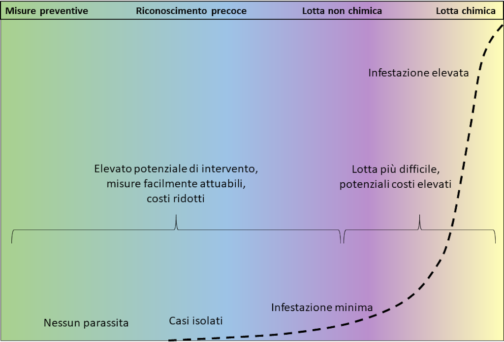 Le misure più efficaci sono quelle adottate quando non vi è ancora nessuna infestazione, quindi poco costose e facili da attuare. Più l’infestazione è in fase avanzata, più è difficile da contrastare e più alti possono essere i relativi costi.
