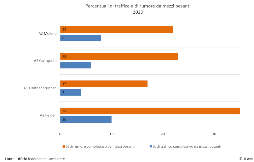 sostanziali dall’inizio delle misure. A Rothenbrunnen (A13), a causa dell’aumento sproporzionato di furgoni e autotreni, le emissioni foniche tendono al rialzo fino al 2011, dopodiché si constata un netto calo delle emissioni del traffico pesante (>3,5t) a causa del cambio della pavimentazione. Lungo la A2, a Camignolo e Moleno, il rinnovo della pavimentazione ha ridotto in misura minore le emissioni foniche del traffico pesante rispetto a quelle del traffico totale.
