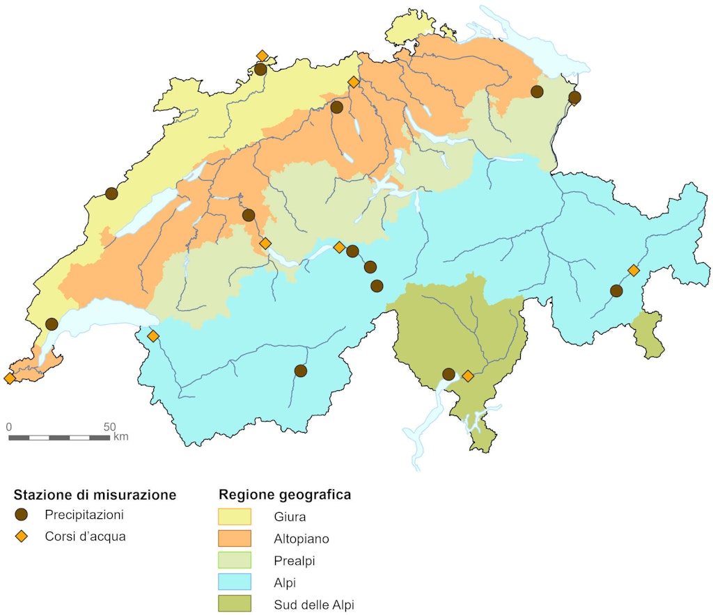 Le 13 stazioni di misurazione delle precipitazioni, sono dislocate nelle diverse regioni climatiche della Svizzera (Giura, Altopiano, Alpi) e coprono inoltre i livelli di altitudine lungo un profilo NO/SE valicando le Alpi da Berna (541 m s.l.m.) attraverso il passo del Grimsel (1950 m s.l.m.) fino a Locarno (379 m s.l.m.). Le stazioni sono situate in prossimità di stazioni meteorologiche di MeteoSvizzera, dove vengono determinati altri parametri come la temperatura e la pressione di vapore.