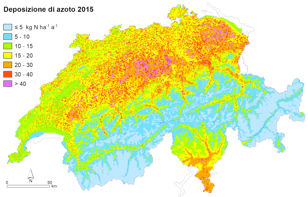 Ad essere elevate, nel confronto europeo, sono soprattutto le emissioni di ammoniaca prodotte dall’agricoltura. L’azoto non conosce confini e viaggia nell’atmosfera: è così che, ad esempio, quello prodotto nella Pianura Padana giunge fino in Ticino. Misure efficaci di protezione dell’aria adottate dalla metà degli anni Ottanta del secolo scorso hanno consentito di ridurre le emissioni d’azoto in Svizzera. Nell’agricoltura il calo è stato molto meno marcato che a livello dei trasporti e dell’industria.