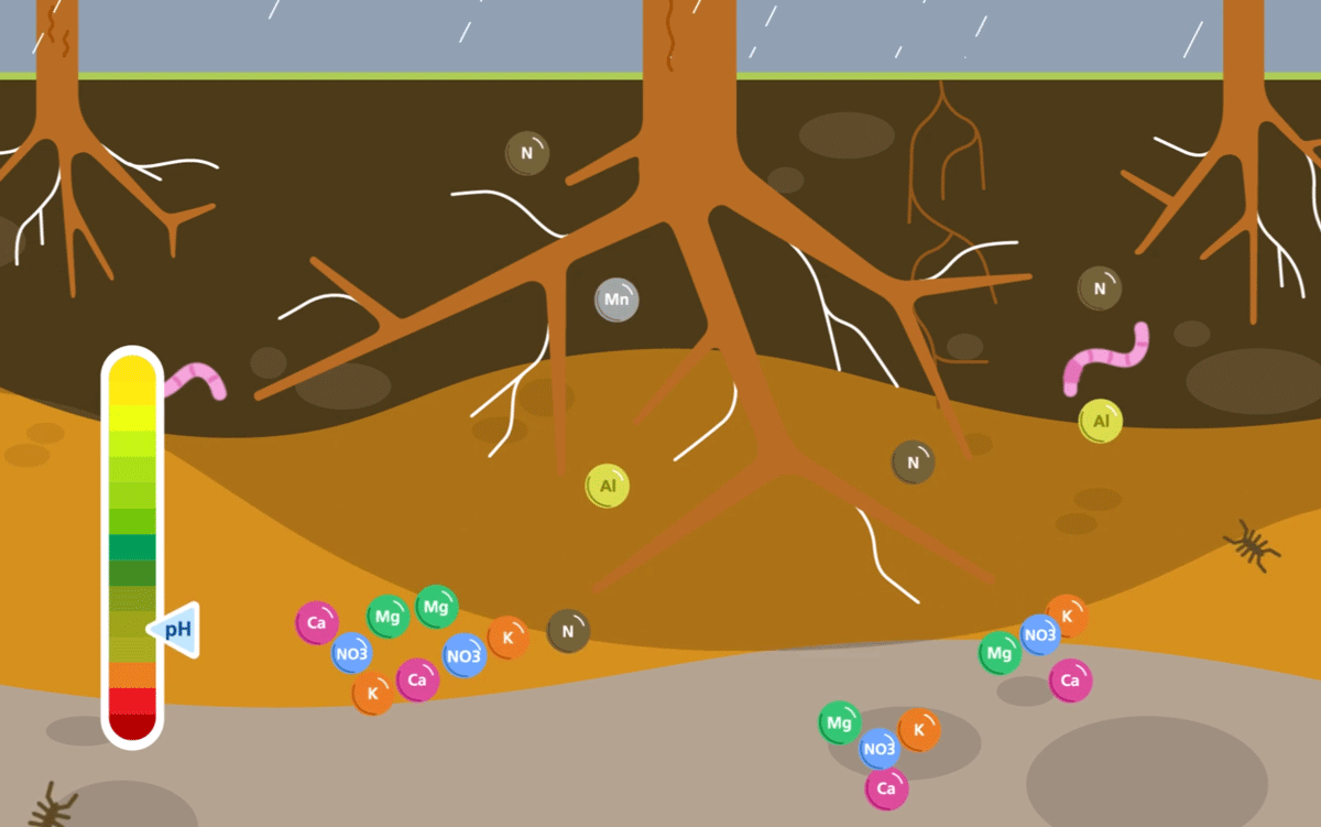 Poiché quest’ultimo si lega a potassio, calcio e magnesio – i cationi «basici» (o cationi BC) – ne consegue una perdita di questi importanti elementi nutritivi dalla rizosfera (ossia la porzione di suolo adiacente alle radici della pianta) e una diminuzione del pH del terreno.