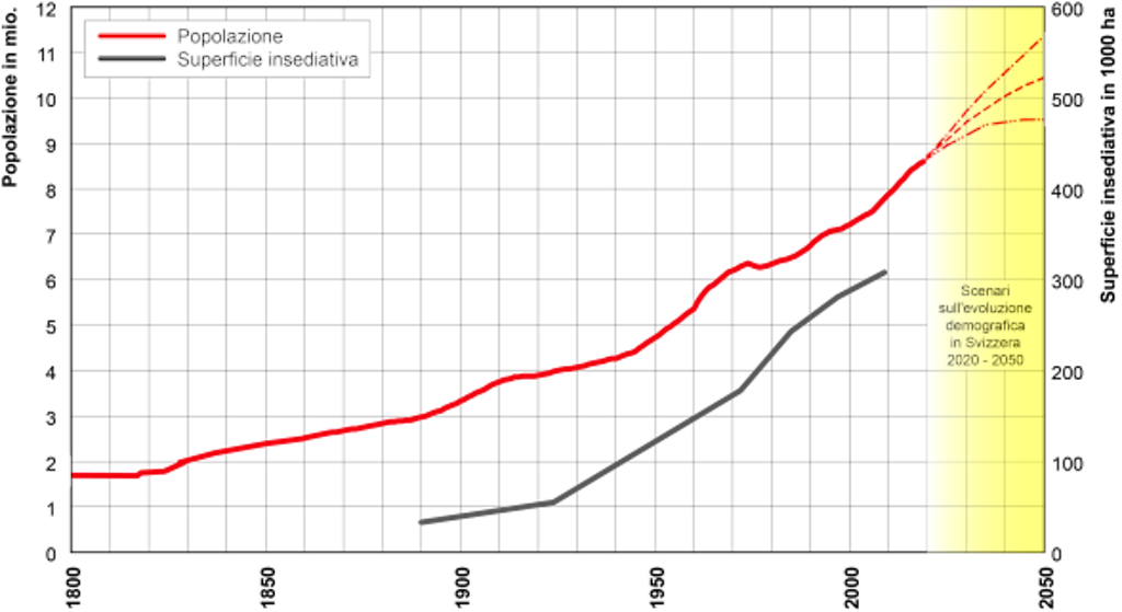 Dalla fine della Prima guerra mondiale, la superficie occupata dalle aree urbanizzate in Svizzera è sestuplicata, passando da 50.000 ettari a oltre 300.000 ettari nel 2009. Questa tendenza si spiega da un lato con l'aumento del fabbisogno di suolo pro capite e dall'altro con la crescita demografica. Durante questo periodo, il numero di abitanti in Svizzera è raddoppiato.
