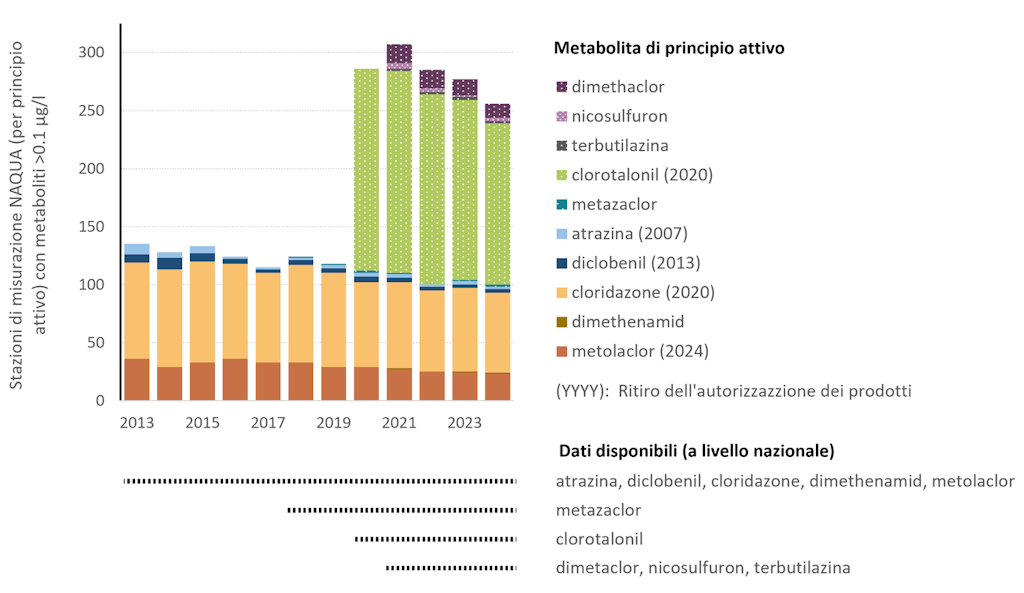 Nelle zone agricole utilizzate in modo intensivo, i metaboliti, ossia i prodotti di degradazione dei pesticidi, sono ampiamente diffusi e vengono regolarmente rilevati in concentrazioni superiori a 0,1 μg/l. Nell'Altipiano centrale superano il valore di 0,1 μg/l in circa il 60 per cento delle stazioni di misurazione. A livello nazionale, il superamento del valore limite interessa una stazione di misurazione NAQUA su tre.