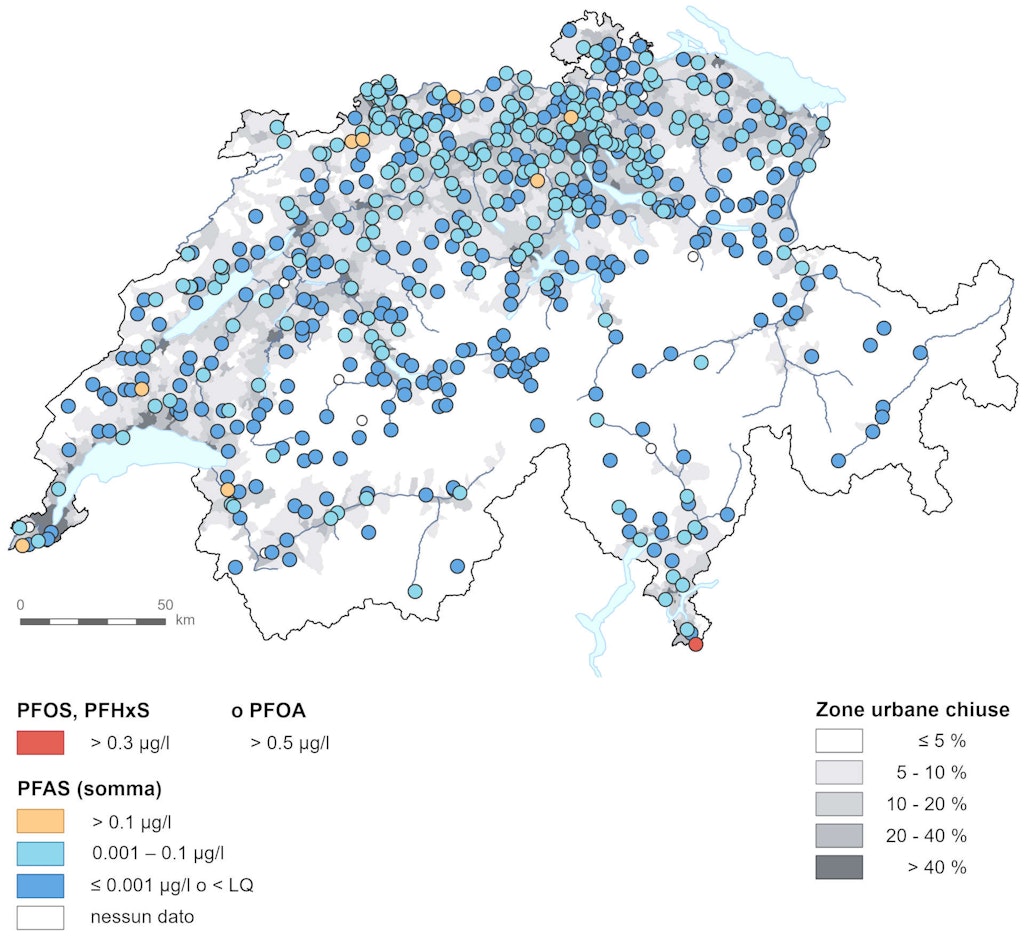 Nel 2021, nell'ambito dell'Osservazione nazionale delle acque sotterranee NAQUA, è stato condotto uno studio pilota sulle PFAS: dai prelievi effettuati nella in quasi 550 stazioni di misurazione NAQUA sono state rilevate complessivamente 26 PFAS diverse. Si tratta di PFAS determinabili in modo affidabile con i metodi analitici standardizzati in uso. Lo studio include le 20 PFAS per cui l'Unione europea (UE) ha stabilito valori limiti nell'acqua potabile.