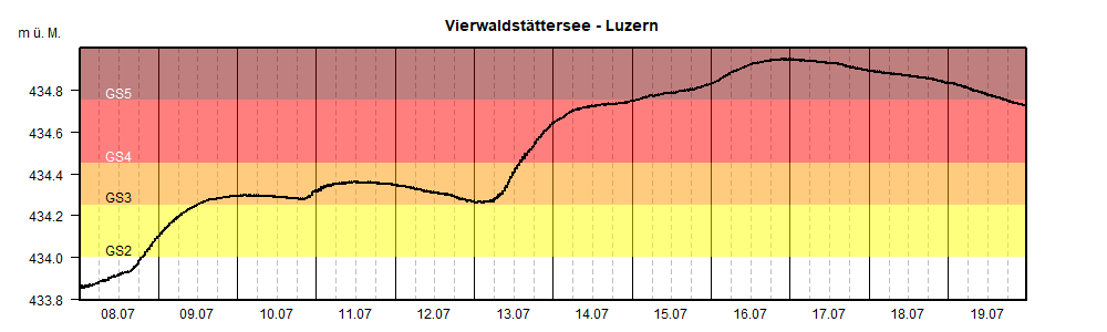 Una situazione molto tesa si è presentata anche sul per il lago dei Quattro Cantoni. L’8 luglio, il livello delle acque ha raggiunto il grado di pericolo 2 e già un giorno dopo il grado di pericolo 3. Ha fatto seguito, il 13 luglio, un ulteriore aumento di 45 cm in un solo giorno, con conseguente allagamento di strade e piazze. I Cantoni della Svizzera centrale hanno sospeso la navigazione. Il lago ha raggiunto nella notte sul 17 luglio il suo picco a 434,95 m (grado di pericolo 5), che corrisponde a un nuovo valore massimo per luglio, ma rimane 28 cm sotto il massimo registrato durante l’evento di piena dell’agosto 2005.