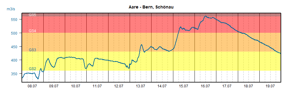 In considerazione delle previsioni meteorologiche, dall’inizio di luglio il servizio di regolazione dei laghi del Cantone di Berna ha iniziato ad abbassare il livello del lago di Thun a fini precauzionali. Tuttavia, con l’inizio delle precipitazioni, il 6 luglio, in breve tempo il livello si è nettamente alzato. Per proteggere le regioni a valle dell’Aare come previsto, la portata in uscita dal lago ha dovuto essere ripetutamente rallentata. Infine, il 15 luglio, il livello del lago ha superato il limite massimo di pericolo 5 (diverse esondazioni possibili). D’altra parte, anche se la portata dell’Aare a Berna ha raggiunto il livello di pericolo 5, le misure di protezione contro le piene adottate sono state sufficienti per prevenire gravi danni alla città di Berna.