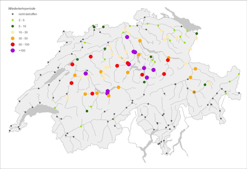 In numerose stazioni di misurazione dell’UFAM, le portate sono giudicate eccezionali. Ai picchi dell’Aare a Thun e a Berna, della Reuss a Lucerna, della Lorze a Frauenthal (ZG) e della Suhre a Oberkirch (LU) può essere attribuita un’annualità di oltre 100 anni, mentre a quelli della Reuss ad Andermatt (UR) e a Mellingen (AG) così come del Riale di Pincascia (TI) da 30 a 50 anni.