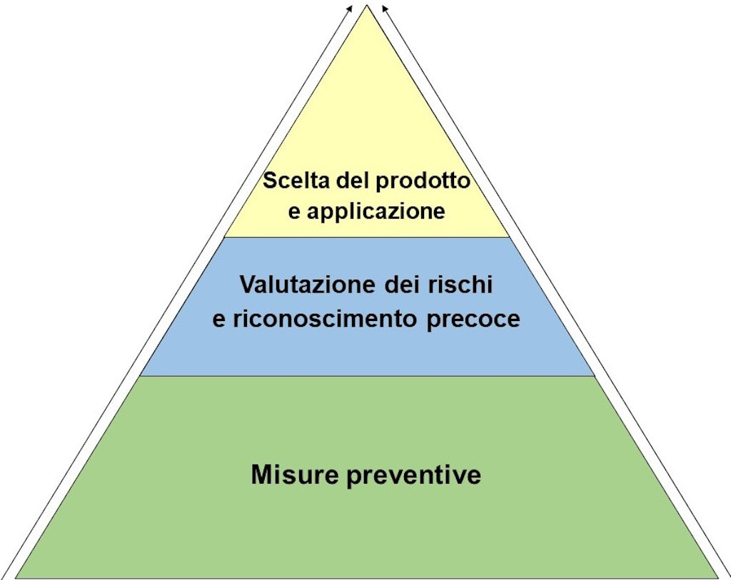 Questo concetto di protezione dei materiali si basa sull’interazione di diverse misure in funzione della situazione. Viene rappresentato attraverso una piramide con struttura a più livelli e persegue un approccio globale alla protezione dei materiali. Analogamente al collaudato concetto di «Protezione integrata delle piante» si può parlare di «Protezione integrata dei materiali».