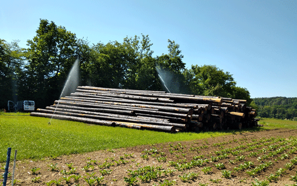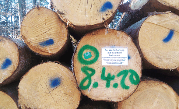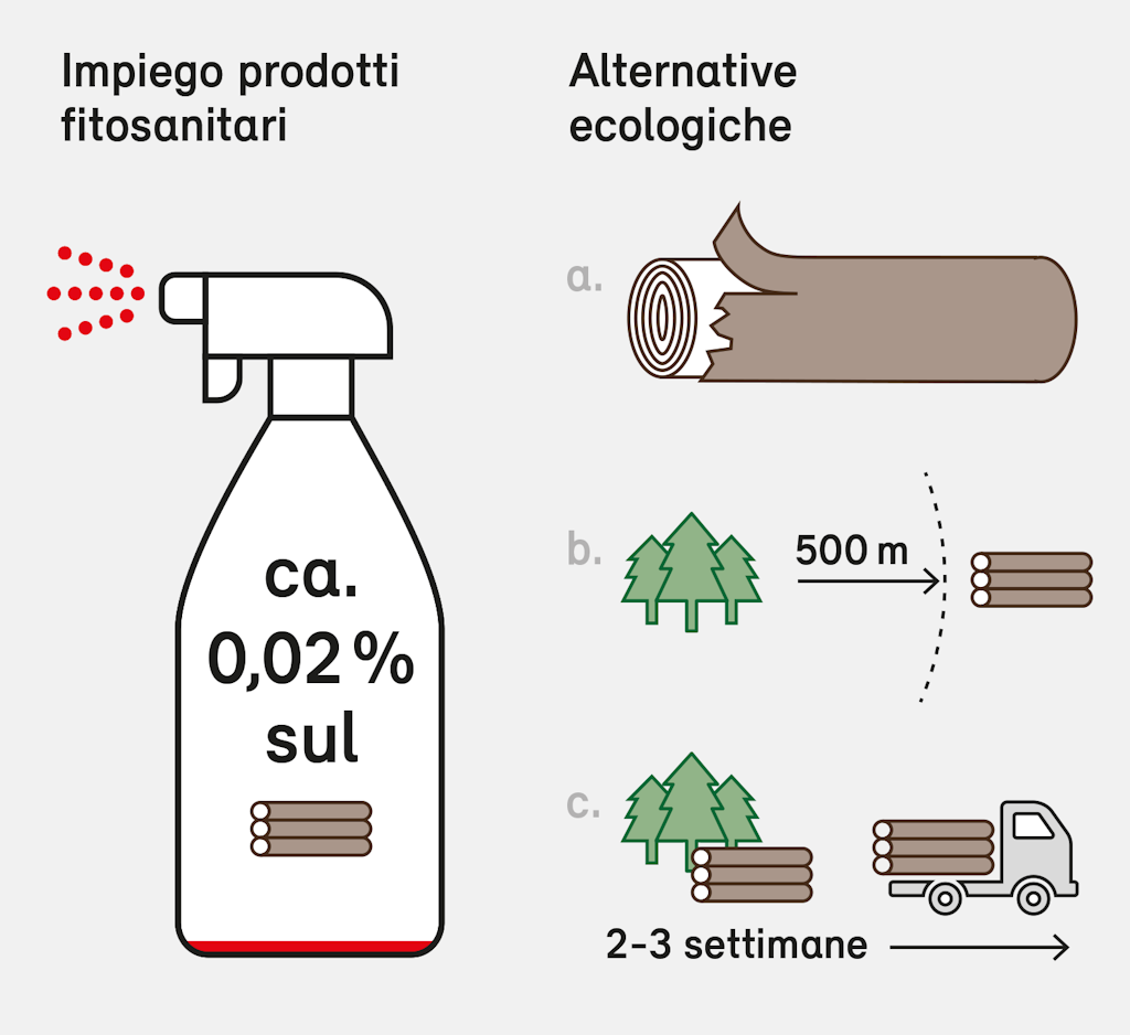Il legno che non può essere prelevato rapidamente dal bosco è occasionalmente trattato con insetticidi al fine di prevenire un’infestazione da coleotteri e quindi un deprezzamento. Di fatto, la legge forestale vieta in linea di principio l’utilizzo di prodotti fitosanitari nei boschi. Tuttavia, sono previste anche delle deroghe, disciplinate nell’ordinanza sulla riduzione dei rischi inerenti ai prodotti chimici e che le autorità cantonali devono autorizzare.