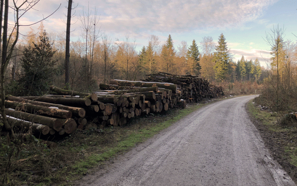Wer gerne im Wald spazieren geht, begegnet ihnen öfters: Mehrere Meter hohe Stapel von Baumstämmen am Wegrand. Auf diesen so genannten Poltern wartet das Holz auf den Abtransport in die Sägewerke.