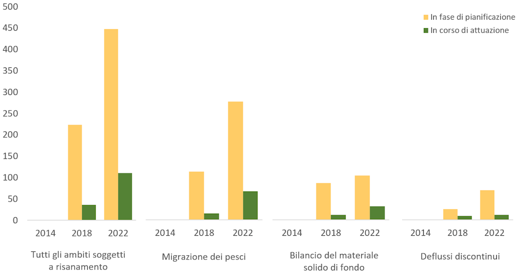 Nel complesso, a fine 2023 i richiedenti hanno ricevuto indennizzi pari a 471,5 milioni di franchi circa per progetti di risanamento: 249,4 milioni per misure di ripristino della migrazione piscicola, 175,7 milioni per misure relative ai deflussi discontinui e 46,3 milioni per misure destinate al materiale solido di fondo (dati aggiornati al 31.12.2023).
