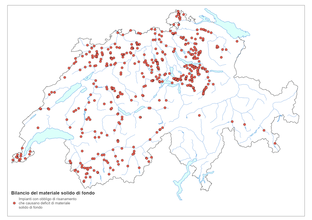 Circa 500 centrali idroelettriche e altri impianti trattengono materiale roccioso di elevato valore ecologico (materiale solido di fondo). Ad esserne interessati sono oltre 2000 chilometri di corsi d’acqua.