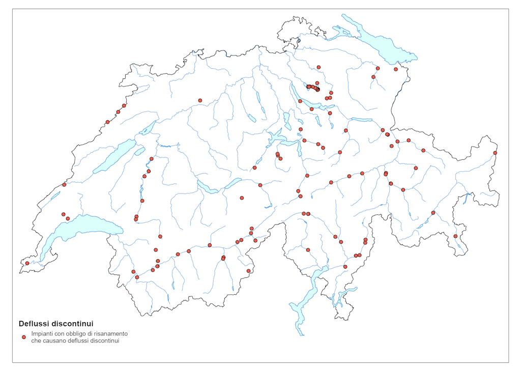 Circa 100 centrali ad accumulazione causano spesso variazioni artificiali del deflusso (deflussi discontinui), che possono far arenare gli organismi acquatici su banchi di ghiaia che si prosciugano in brevissimo tempo o spazzarli via a causa di improvvise ondate di piena. Sono circa 1000 i chilometri di corsi d’acqua interessati da questo fenomeno
