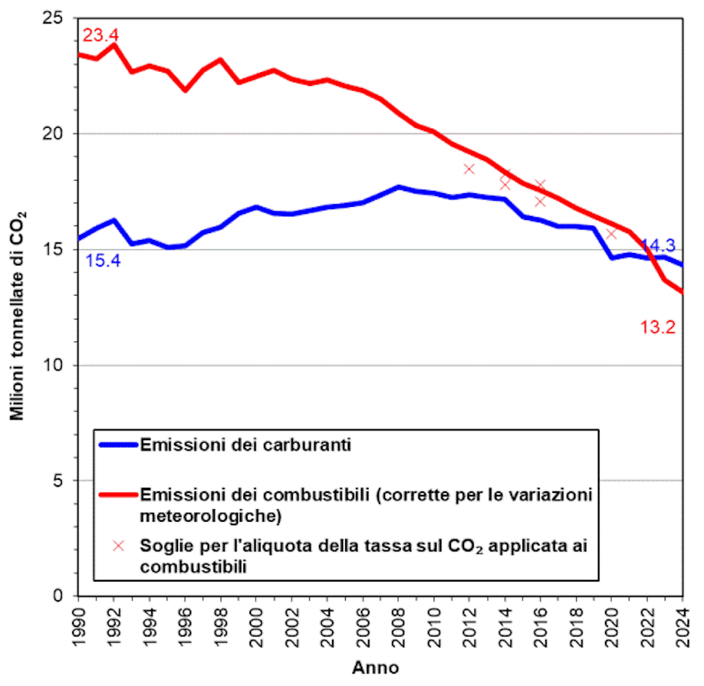 Al fine di ridurre le emissioni di CO₂, in Svizzera viene applicata una tassa sul CO₂ prodotto dai combustibili. Tra il 2008 e il 2020, l’aliquota della tassa è stata periodicamente aumentata in modo automatico ogni qual volta le emissioni di CO₂ provenienti dai combustibili eccedevano le soglie previste dalla legge; al momento, la legislazione non prevede ulteriori aumenti. Sui carburanti non viene invece riscossa alcuna tassa sul CO₂, ma gli importatori devono compensare una certa quota percentuale di emissioni provenienti dai carburanti, che aumenta gradualmente negli anni. La statistica del CO₂ registra le emissioni provenienti dai combustibili e dai carburanti.