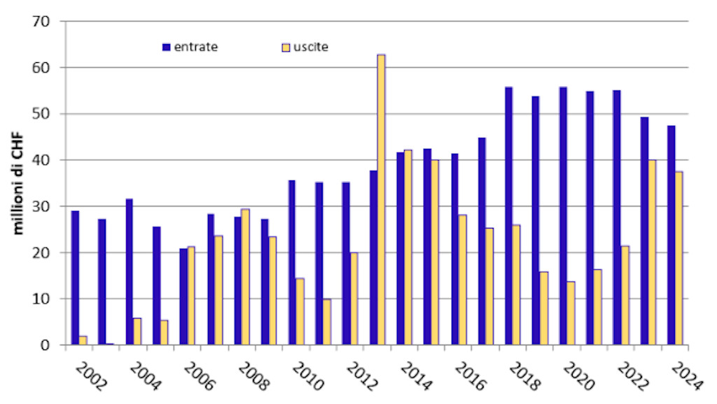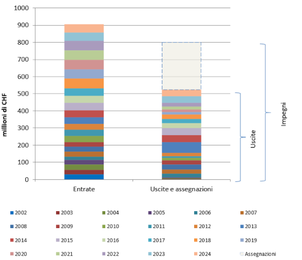 Le indennità versate OTaRSi per un totale di 524 milioni di CHF e le assegnazioni di 276 milioni di CHF tra il 2002 e il 2024 sono compensati da entrate OTaRSi per 905 milioni di CHF. La somma degli esborsi e delle assegnazioni corrisponde all'importo totale impegnato di circa 800 milioni di CHF. La differenza tra il totale delle entrate OTaRSi e l'importo impegnato determina un saldo (virtuale) del conto al 31 dicembre 2024 pari a 105 milioni di CHF (cfr. Fig. 3).