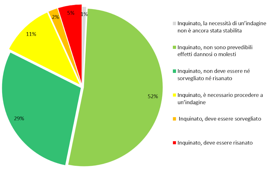 Dalla valutazione delle autorità esecutive si evince che per oltre la metà (53%) dei siti inquinati non sono necessarie indagini in quanto non si prevedono pericoli per l'ambiente. Per un ulteriore 29 per cento dei siti, l'indagine effettuata non ha evidenziato necessità di sorveglianza o di risanamento. Dal punto di vista della legislazione in materia, per più di tre quarti dei siti non sono dunque necessarie misure supplementari.