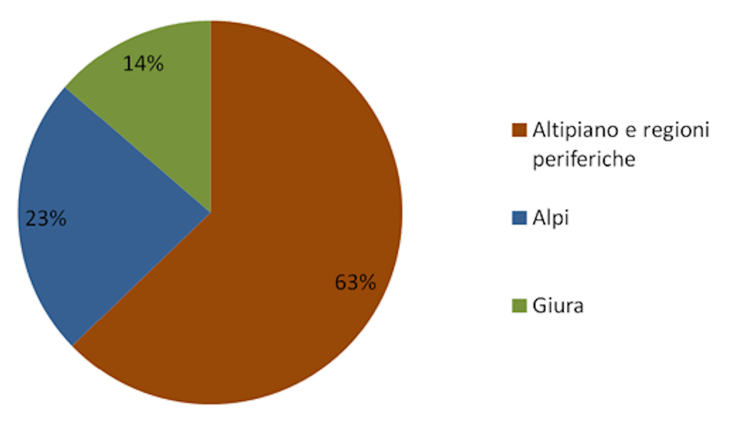 I due terzi circa dei siti inquinati si trovano, come era da prevedere, sull'Altipiano. La densità demografica e le attività economiche sono infatti preponderanti in questa parte del nostro Paese. Il 14 per cento dei siti inquinati si trova nel Giura svizzero, mentre il rimanente 23 per cento è ripartito sul resto del territorio nazionale.