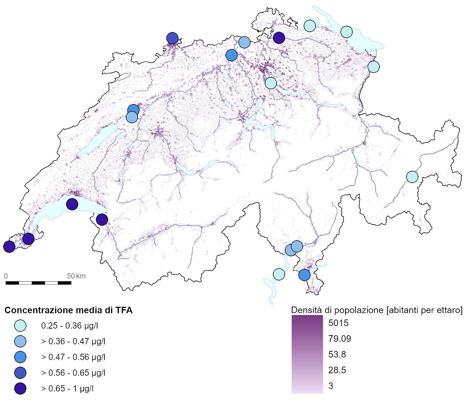 Le concentrazioni di TFA nei fiumi erano comprese tra 0,21 μg/l e 2,8 μg/l, con valori più elevati osservati a valle. Tale aumento riflette l’immissione di acque di scarico industriali e comunali. Il Rodano, la Thur e il Reno a valle di Basilea presentavano concentrazioni di TFA più elevate (media tra 0,80 e 0,88 μg/l), mentre i valori più bassi sono stati riscontrati nell’Inn a S-chanf (media 0,33 μg/l).