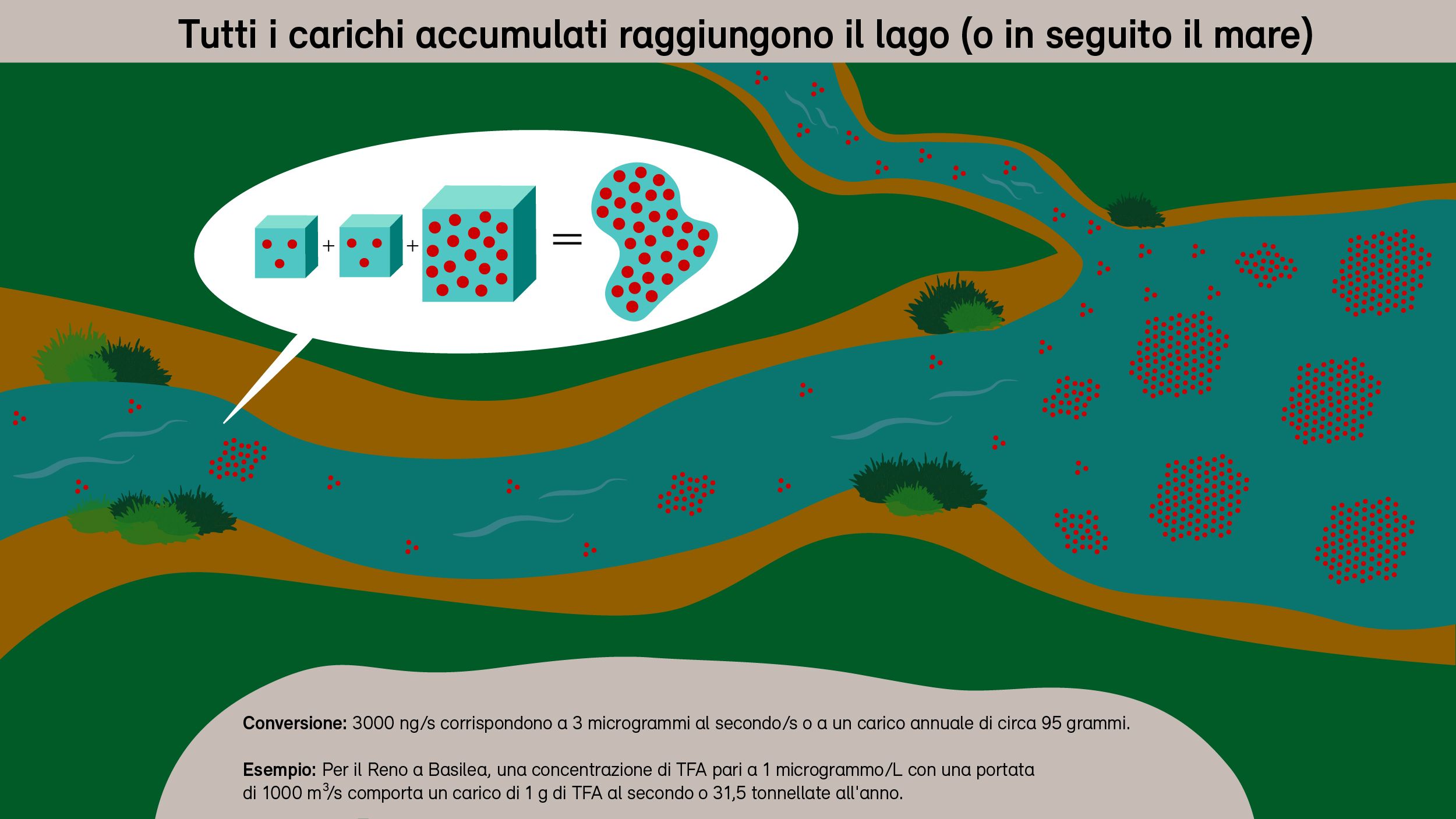 Analogamente alle concentrazioni, anche i carichi aumentano lungo il corso d’acqua e raggiungono i valori più elevati nei punti di uscita dei bacini imbriferi. Ogni anno, più di 30 tonnellate di TFA raggiungono il mare attraverso i fiumi svizzeri, con i carichi più elevati trasportati dal Reno (20 t) e dal Rodano (8 t).