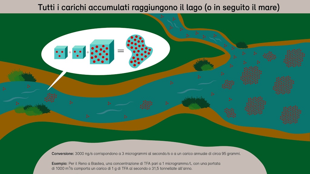 L’acido trifluoroacetico (TFA) è presente nei fiumi e nei laghi svizzeri. Nei fiumi, le sue concentrazioni tendono a essere più elevate a valle, dove le sostanze si accumulano. Nei laghi, i picchi di concentrazione sono spesso inferiori rispetto a quelli dei fiumi, poiché il grande volume d’acqua dei laghi diluisce le sostanze e numerosi laghi sono situati più a monte. Ogni anno, più di 30 tonnellate di TFA raggiungono il mare attraverso i fiumi svizzeri, come emerso da analisi eseguite tra il 2020 e il 2023 su una selezione di acque superficiali del nostro Paese. Il confronto con i campioni d’archivio rivela inoltre che le concentrazioni di TFA sono aumentate di sei volte rispetto agli anni Ottanta e Novanta.