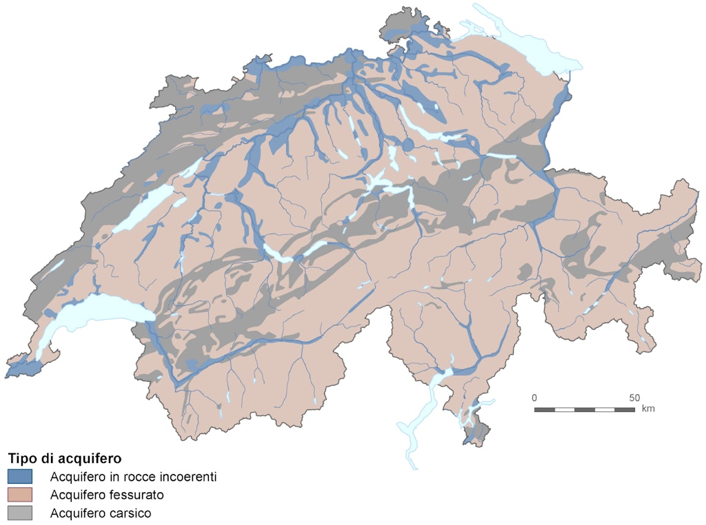 Le riserve idriche sotterranee della Svizzera più importanti per l’economia idrica si trovano nelle rocce incoerenti vicine alla superficie delle valli fluviali dell’Altipiano e lungo le principali valli alpine. Anche le zone carsiche del Giura e delle Alpi con le loro grandi sorgenti sono importanti fonti di acque sotterranee. Le rocce molassiche, porose e fessurate, dell’Altipiano e le rocce cristalline fessurate delle Alpi racchiudono riserve idriche sotterranee vicine alla superficie d’importanza locale. Nella roccia sono inoltre presenti sistemi di deflusso delle acque sotterranee che consentono di alimentare fonti termali e minerali.