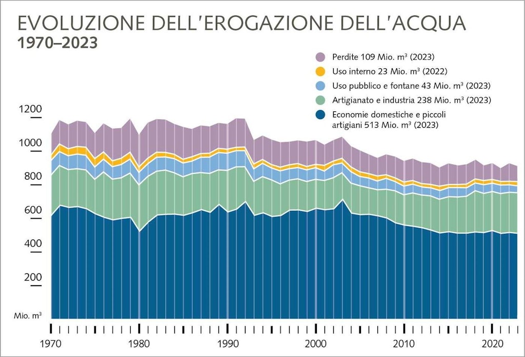 L'approvvigionamento idrico pubblico include la fornitura di acqua potabile a economie domestiche, industria e artigianato. L'Associazione svizzera per l'acqua, il gas e il calore (SSIGA) effettua ogni anno rilevamenti di dati e proiezioni per l'approvvigionamento idrico pubblico in Svizzera. Nel 2021, l'approvvigionamento idrico pubblico ha fornito 914 milioni di metri cubi di acqua (UST 2023). Nonostante un leggero aumento del consumo in questi ultimi anni dopo un calo costante dagli anni 1990, le previsioni attuali lasciano presumere una domanda relativamente stabile per il futuro. Tuttavia, saranno critici i periodi prolungati di siccità e canicola che porteranno a picchi di domanda elevati e che potrebbero sovraccaricare l'infrastruttura di approvvigionamento idrico.