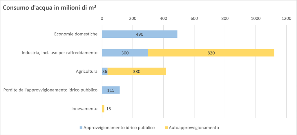 Per quanto concerne il consumo di acqua dell'autoapprovvigionamento di industria, artigianato e settore dei servizi è disponibile un unico rilevamento e una proiezione risalenti al 2006. Quell'anno il consumo di acqua è stato pari a 1120 milioni di metri cubi, di cui due terzi utilizzati per il raffreddamento e la climatizzazione. A tale volume si aggiunge l'acqua di raffreddamento immessa nei corsi d'acqua dalle centrali nucleari, pari a circa 1600 milioni di metri cubi l'anno.