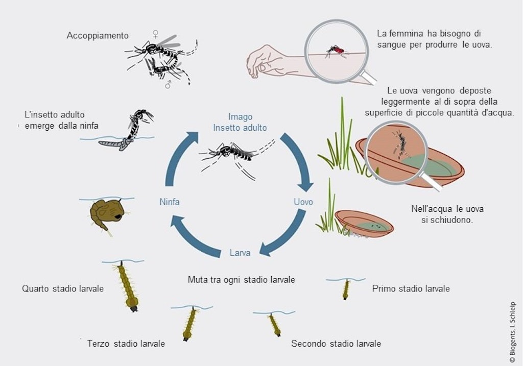 Le zanzare depongono le uova nell’acqua o nelle sue vicinanze, dove le loro larve si sviluppano e si trasformano in crisalide per poi allontanarsi una volta raggiunto lo stadio adulto. Le zanzare adulte si nutrono di nettare e acqua, ma le femmine hanno bisogno di sangue per produrre le uova. Le femmine delle specie autoctone di zanzare di solito succhiano il sangue al crepuscolo e di notte, ma alcune specie succhiano il sangue anche durante il giorno.