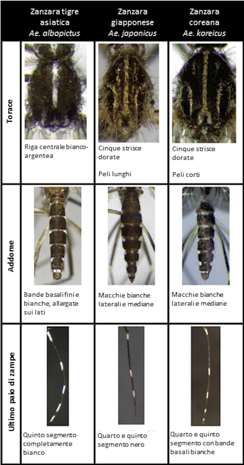 Attualmente in Svizzera sono state individuate tre specie esotiche di zanzare: la zanzara tigre asiatica (Aedes albopictus), la zanzara giapponese (Aedes japonicus) e la zanzara coreana (Aedes koreicus). Queste tre specie esotiche sono aggressive e succhiano il sangue anche di giorno. Covano nei recipienti, cioè depongono le loro uova sulle pareti di recipienti contenenti acqua stagnante. La zanzara tigre asiatica può trasmettere i virus Dengue, Chikungunya e Zika, oltre a circa 20 altri agenti patogeni. In Svizzera sia le autorità federali sia quelle cantonali sorvegliano e combattono questa specie di zanzara. Se viene trovata una zanzara a strisce bianche e nere, deve essere inviata a uno dei quattro centri regionali di segnalazione per le specie di zanzare esotiche (cfr. riconoscimento precoce).